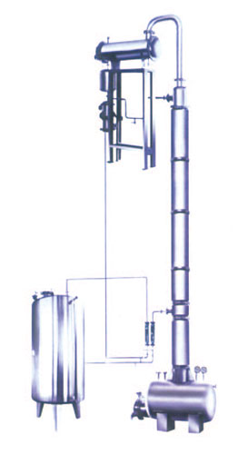 本裝置采用高效的金屬不銹鋼填料。蒸餾塔采用不銹鋼制,從而防止鐵屑堵塔填料的現(xiàn)象,延長了裝置的使用期限。本裝置中凡接觸酒精設(shè)備部分如冷凝器、穩(wěn)壓罐、冷卻蛇管等均采用不銹鋼,以確保成品酒精不被污染。蒸餾釜采用可拆工U型加熱管,在檢測時(shí)可將U型加熱管拉出釜外,便于對(duì)加熱管外壁及蒸餾釜壁進(jìn)行清洗。本裝置可間歇生產(chǎn),也可半連續(xù)、連續(xù)生產(chǎn)。